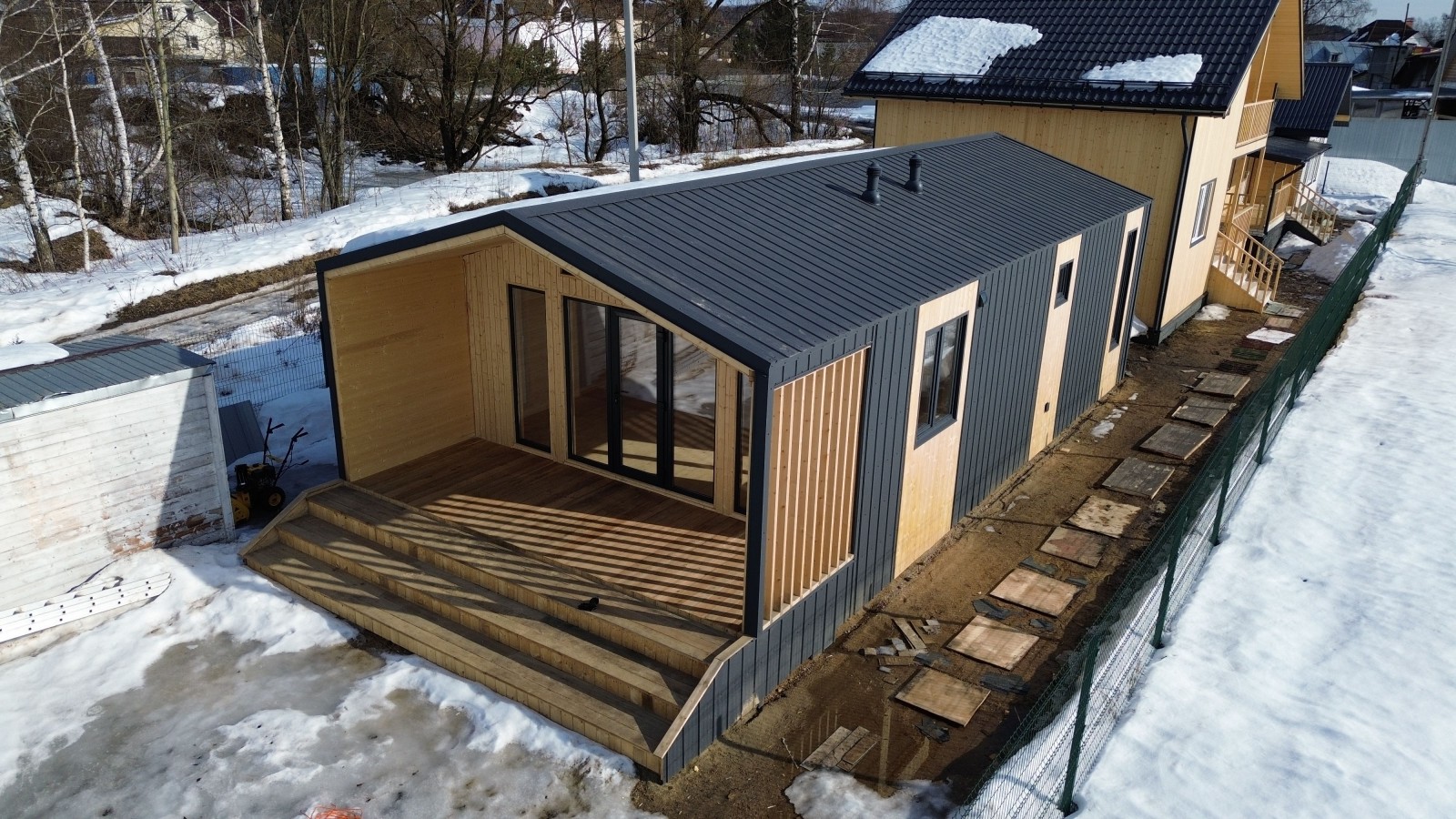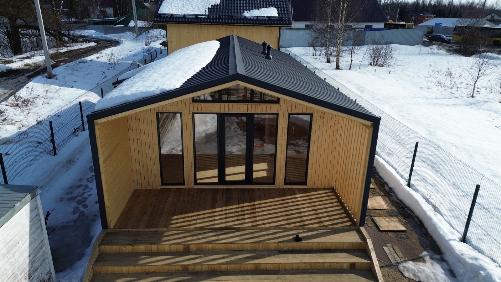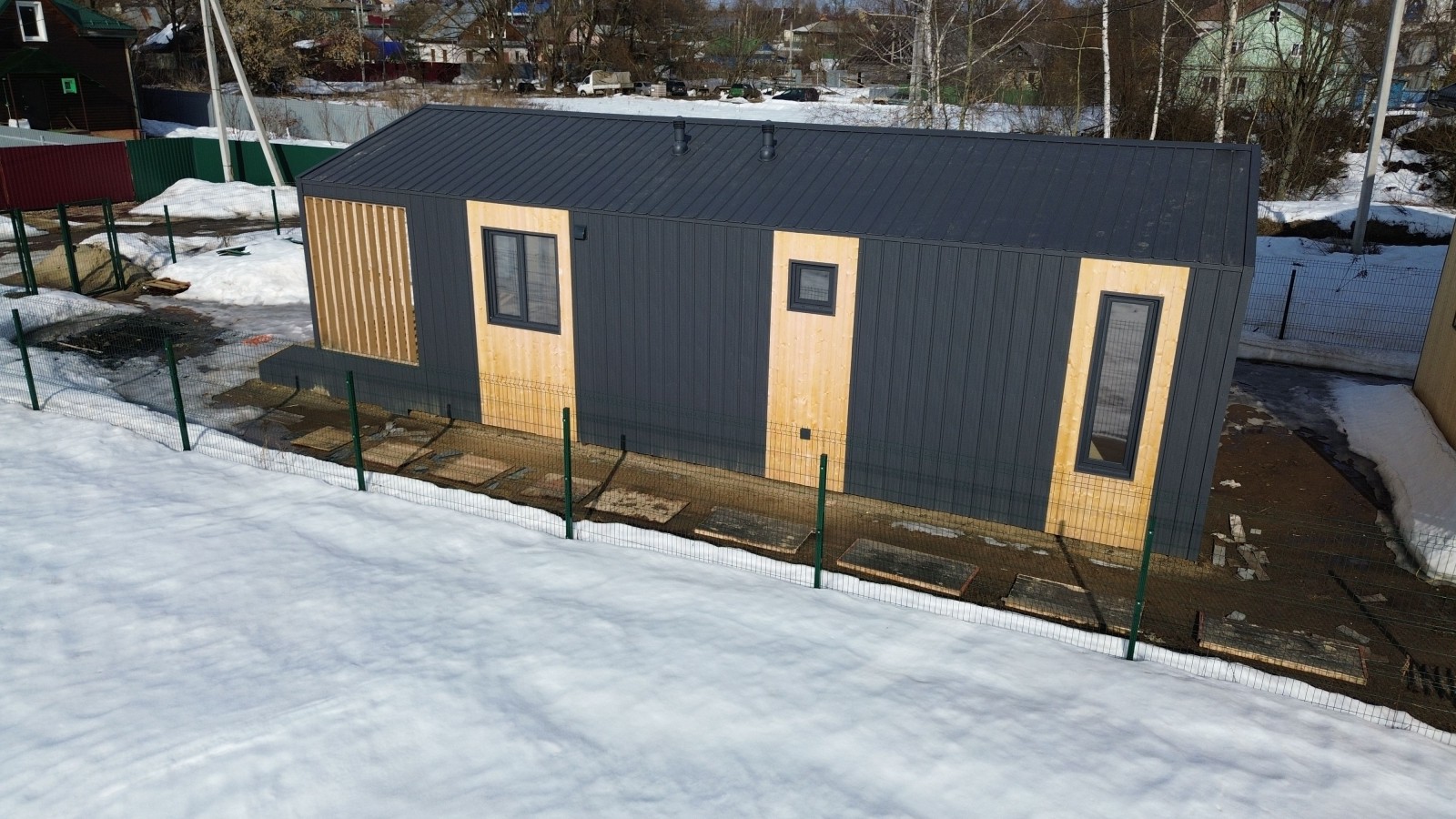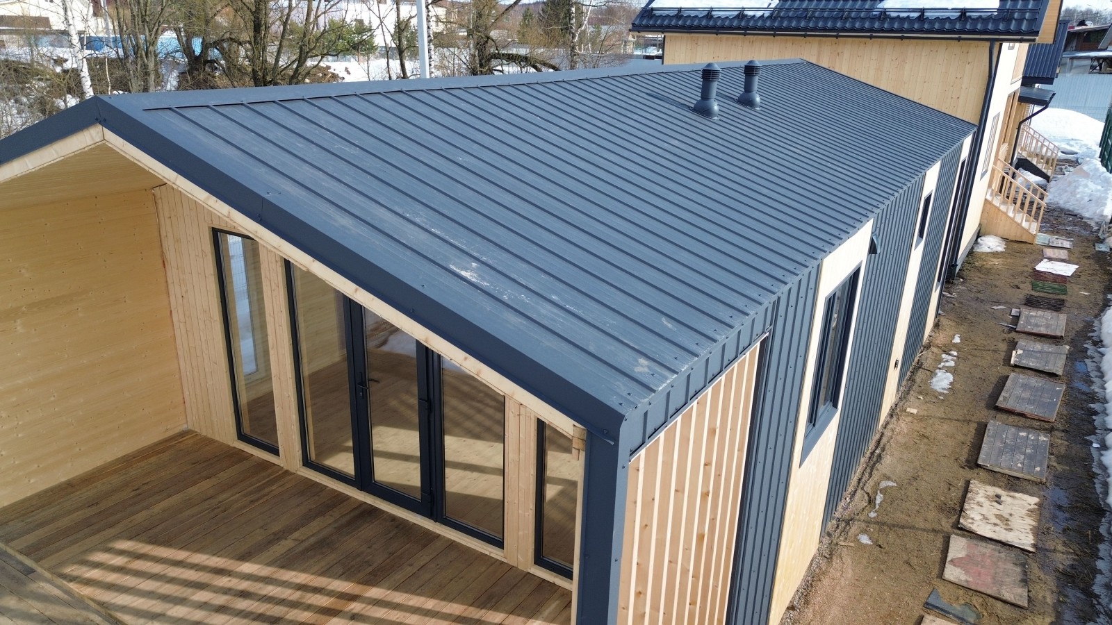 Для Вас на выставочной площадке представлен образец одноэтажного каркасного Барнхауса 13х6 общей площадью 80 кв.м.